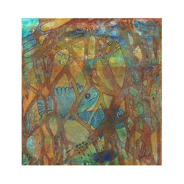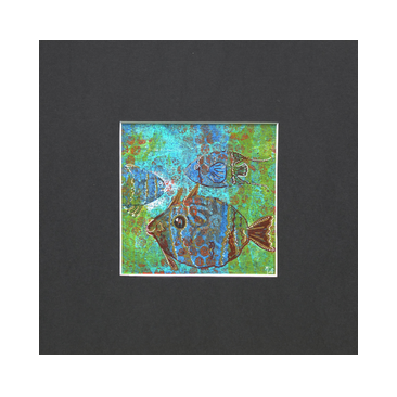 VISSEN 01. Bewerkte print op dik papier 19,5x19,5 cm. Incl. lijst en passe-partout 33 x 33 cm. VERKOCHT