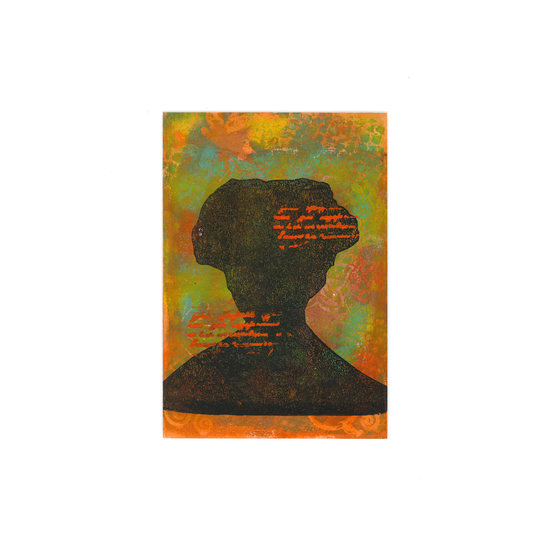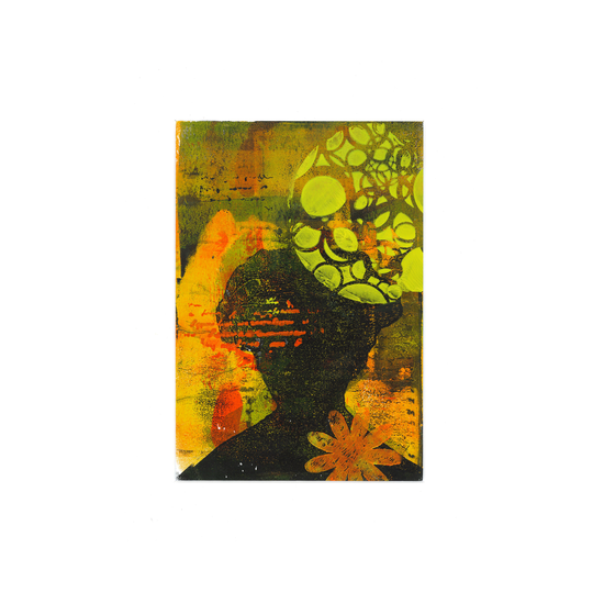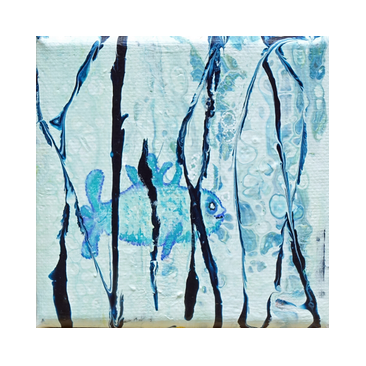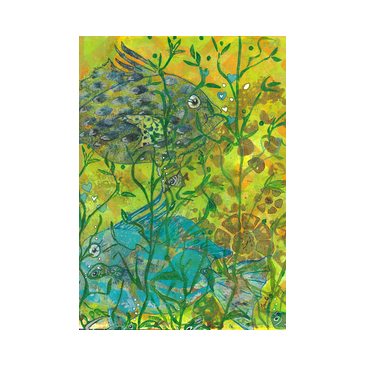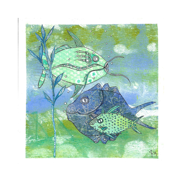 VISSEN 03. Bewerkte print + collage op dik papier 18,5x18,5 cm. € 17,50