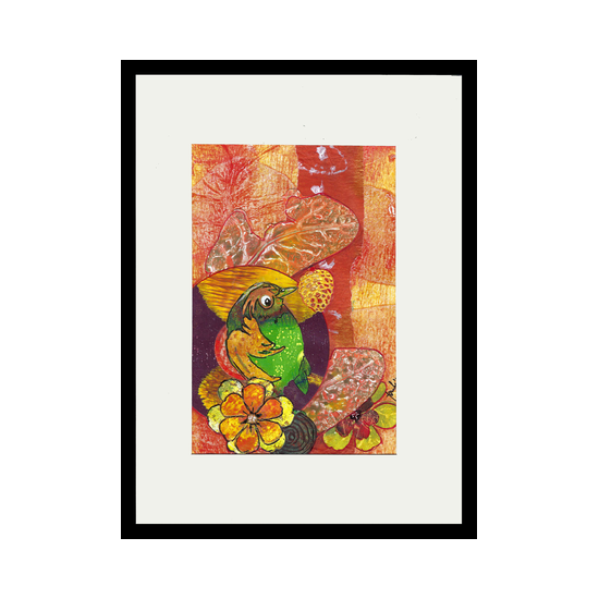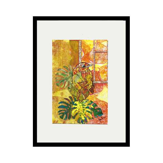 "HIDE AND SEEK". Collage op acrylpapier 30x42 cm. Met passe-partout 40x50 cm. € 85,-