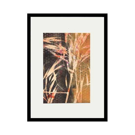 "ABSTRACT SCRIPT MET BLOEMEN". Passe-partout en lijst 50x60 cm. € 195,-