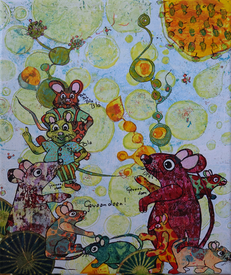 Binnen zitten is voor mij geen straf, het komt mijn productie ten goede. Alhoewel de coronamaatregelen mij niet licht vielen leefde ik mij creatief uit. Door te experimenteren en op basis daarvan nieuw werk te maken. Aan ieder werk gaan vele proefdrukken vooraf die later (soms jaren later) weer gebruikt worden als basis voor kaarten. Ja, die maak ik ook nog steeds. Dat de kippen bij mij vaak verschijnen en symbool staan voor menselijk gedrag zal inmiddels van mij bekend zijn. Daarmee kan ik actuele thema's belichten of op de hak nemen zonder "politiek" te bedrijven.