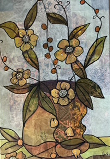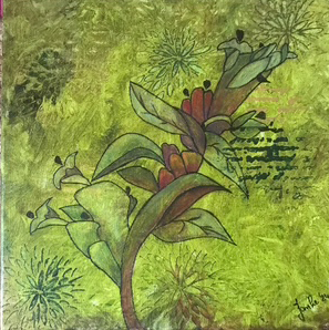"Vaas met bloemen'. Collage/negative painting op 40 x 60 doek. € 175,-,