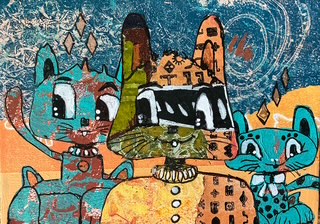 'Poezen'. Collage op MDFpaneel, kan hangen en los staan. € 25,-
