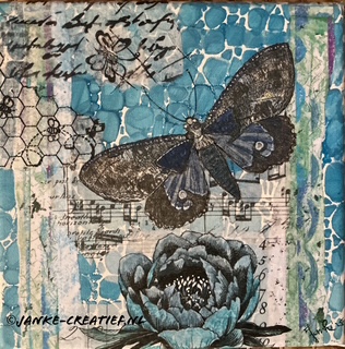 ‘Vlinder’. Collage met monoprint papier op doek 20 x 20 cm. € 45,-
