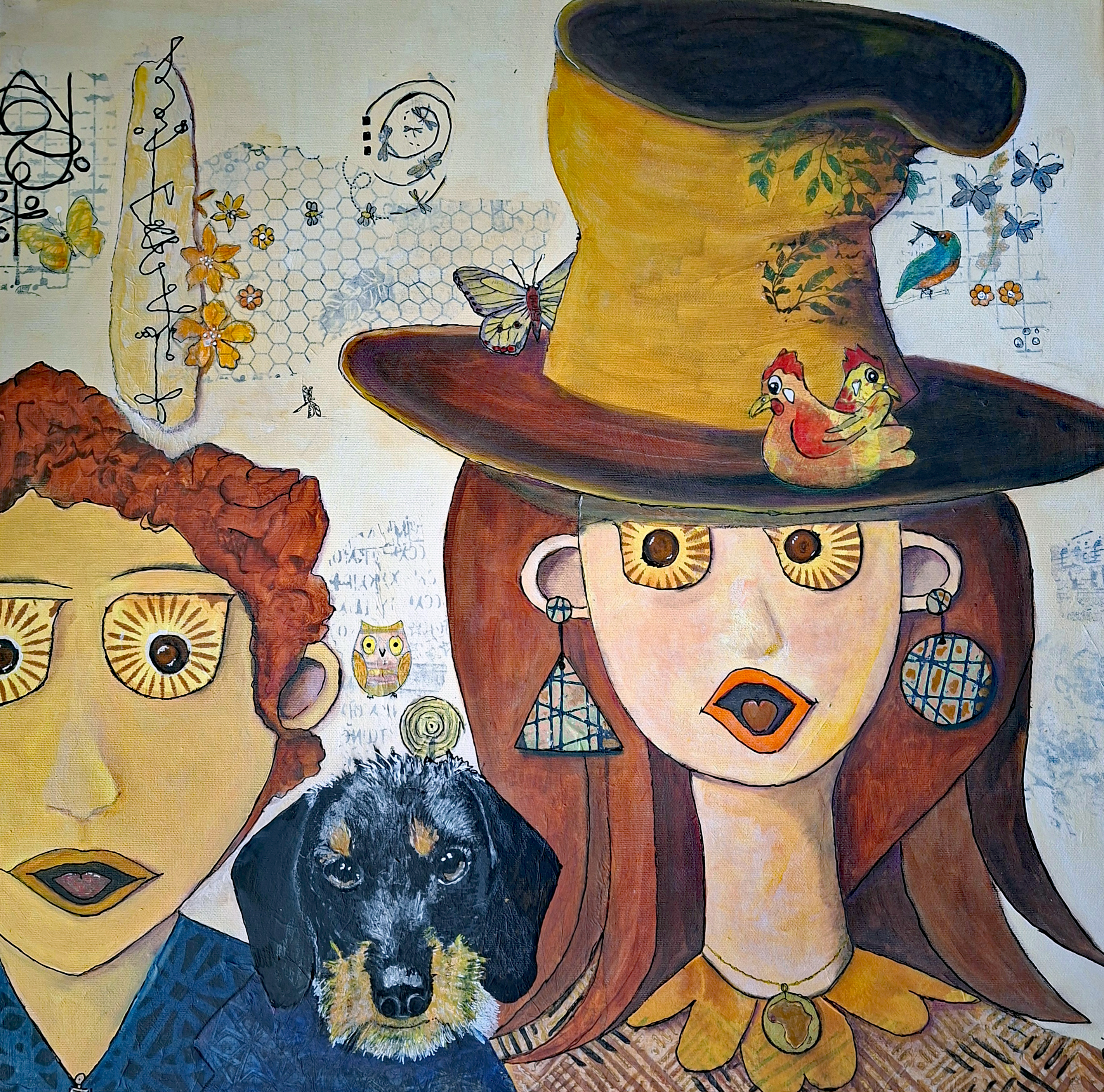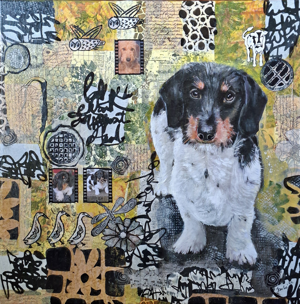 ‘Onze Piebald teckel Mats’. Collage/mixedmedia, met o.a. monoprintpapier, 60 x 60 cm op 3D doek. PRIVE BEZIT.